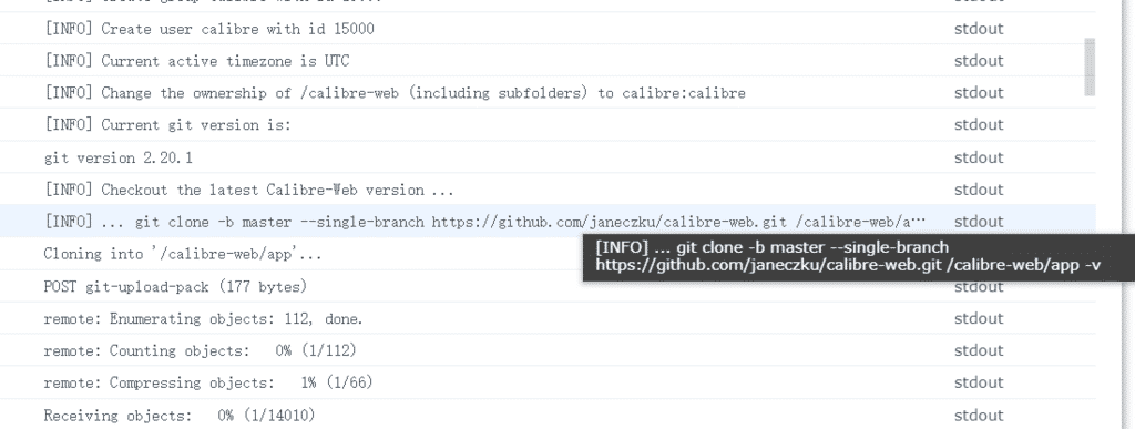 6、随后启动容器,进入容器详情—终端机,会看见后台在下载很多代码,路由器上技术处理是必备的,不然需要等待很久。